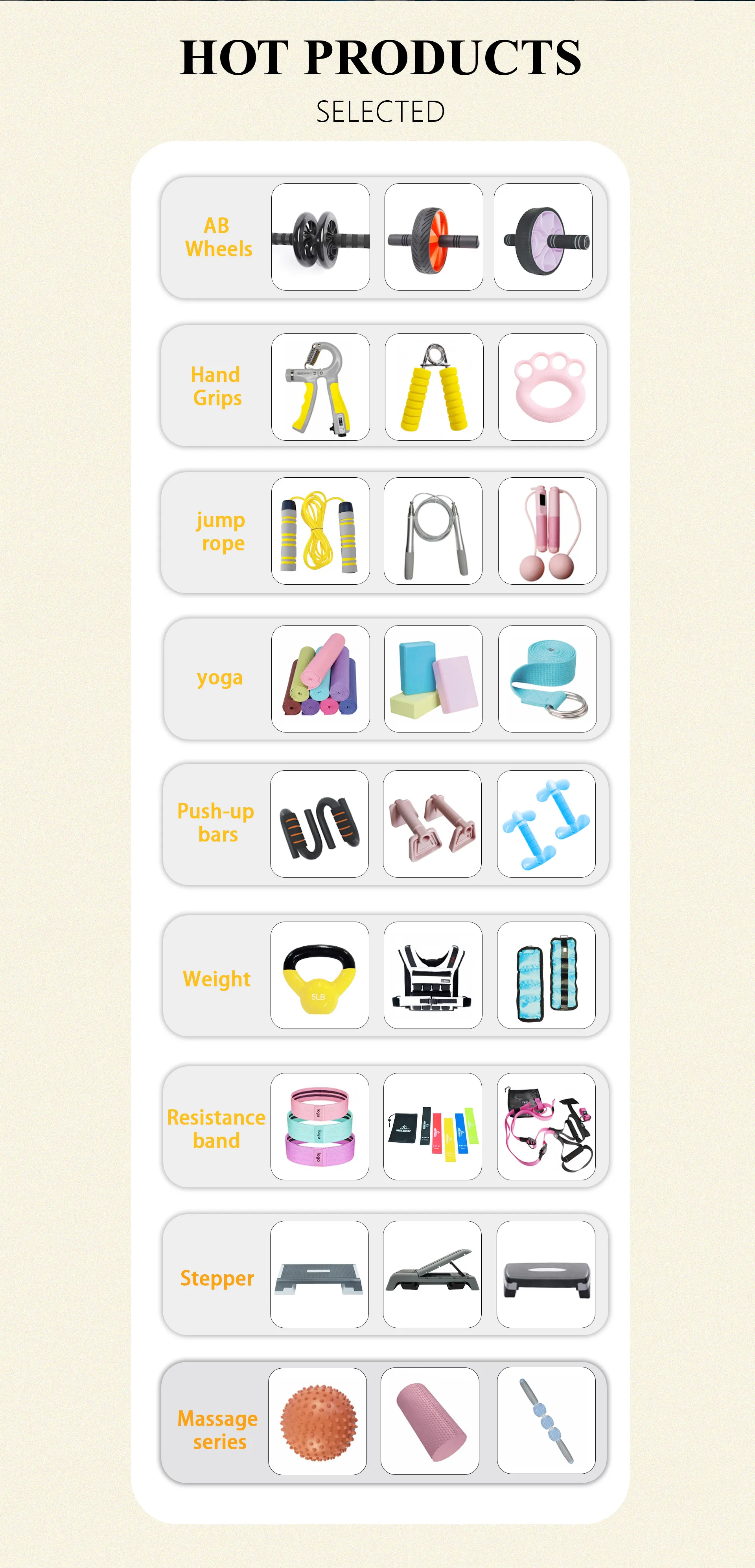 Established in 2014, Winz-sports stands as a leading manufacturer of high-performance plastic components for the global sporting goods industry. We specialize in designing and producing premium fitness essentials including grippers, skipping ropes, resistance series, abdominal wheels, ect. End-to-End Excellence From innovative R&D and precision manufacturing to professional color box packaging design, we deliver comprehensive product lifecycle solutions. Our customer-centric approach prioritizes:Engineering Integrity: Rigorous quality control ensures durability, safety, and peak performance in every component. Collaborative Innovation: We co-create tailored products and packaging to meet evolving market demands. Reliable Partnership: Agile communication, flexible production, and on-time delivery define our service ethos. Certificate: BSCI, ISO14001 Driven by Purpose:Our mission-"Make Fitness Accessible for Every Home"-fuels our commitment to empowering active lifestyles worldwide. We engineer equipment that transforms homes into hubs of wellness, building healthier communities through accessible, premium fitness solutions.